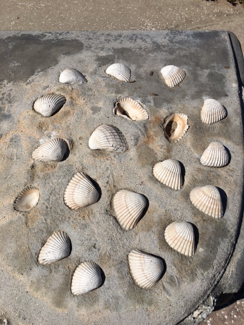 White shells embedded in cement.